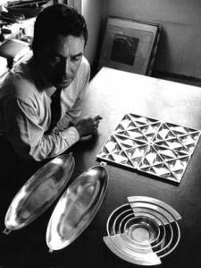 A escolha do artista polivalente se casa com o intuito de exemplificar a abrangência do design. Na foto abaixo, o artista e alguns dos utensílios projetados por ele e produzidos pela Sambonet nos anos 1970.