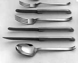 Na parte dedicada aos objetos, há talheres, panelas e utensílios de cozinha e mesa em aço inox, vasos de vidro e embalagens sofisticadamente articuladas. Projetos para a empresa SpI, Sambonet Paderno Industria, que é uma das maiores empresas italianas na área de talheres e objetos de inox e que mantém em linha alguns de seus desenhos originais.