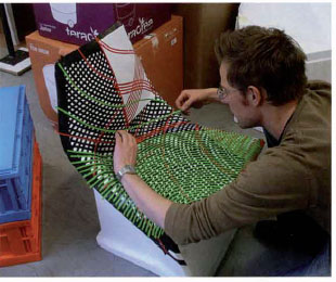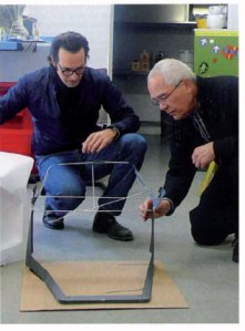 Uma sala simulando sua linha de produção e uma cápsula de testes de impacto foi montada dentro da Trienalle de Milão. Na foto abaixo, Konstantin Gcric e Martin Plank estudam modelo da cadeira.