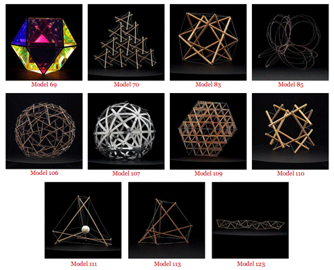 Também estão modelos das geodésicas, de secções de sua estruturas, incluindo também um modelo do sistema Tensegrity, desenvolvido pelo aluno de Fuller Kenneth Snelson.