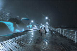 A promessa, digamos, poética, do projeto é a iluminação. À noite, dispositivos fotoluminosos que captaram a energia solar durante o dia criarão uma atmosfera imersiva, dando a ilusão de que se está em alto mar.