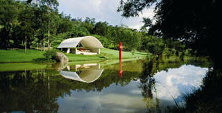 Com uma cobertura curva e a cruz vermelha implantada na água, a capela, segundo Tozzi, é uma catedral da natureza.