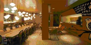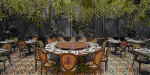 O mobiliário é bem escolhido, com cadeiras de palhinha e mesas com assoalho, piso de ladrilhos hidráulicos bem feito. Mas o que mais me chamou a atenção foram os enormes muxarabis, a instalação feita com lustres pendentes e as paredes de terra.