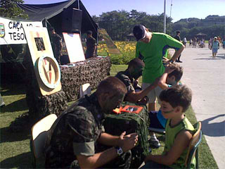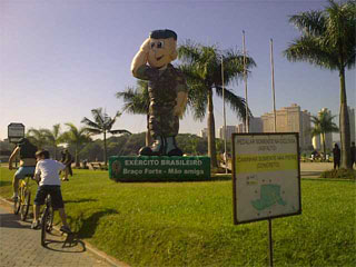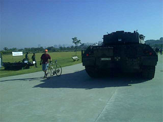 Já tinha visto no sábado, 18, barracas de acampamento montadas, homens de uniforme, quase todos de óculos escuros, fazendo demonstrações com caminhões camuflados muito altos, tanques, motos, lança-chamas, e distribuindo panfletos. As crianças e os adultos subiam nos caminhões, entravam nos tanques e ficaram seduzidos pelos objetos, posando, experimentando a posição de quem dirige, fazendo fotos com os equipamentos e ao lado dos soldados.