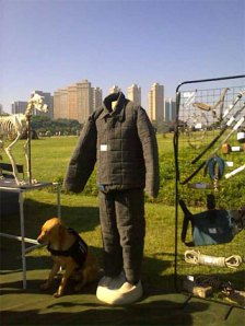 Outra barraca que chamou bem a atenção das crianças foi a de adestramento dos animais, que exibia um esqueleto de cão enorme, preso numa gradinha, logo acima de um cão empalhado. As crianças pequenas acariciavam o cão empalhado numa boa. Ele estava do lado de um cabide com uma roupa grossa, parecendo de longe com o terno de feltro Joseph Beuys, usada para “para afiar a mordida dos cães”, segundo o soldado que demonstrava os equipamentos, que não sabia do que era feita a roupa.