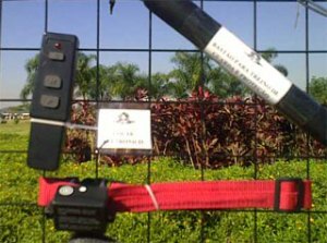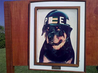 Na grade bem ao lado, vários instrumentos de treinamento (para humanos) e tortura (para cães) do exército: varinhas, porretes e coleiras que dão choque, por exemplo. Uma foto de um cão-herói muito simpático pode fazer pensar que talvez os cães tenham uma quedinha por uniformes e adereços bacanas como os das Forças Armadas. Caramba!