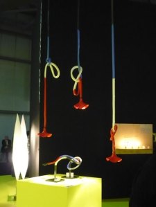 Modelos de mesa e teto da “Zufall” no estande de Ingo Maurer na Euroluce, salão de iluminação que acontece em Milão