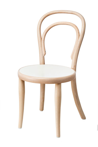 A cadeira desenhada por Michel Thonet em 1859 e que já alcançou a marca das 50 milhões de unidades foi reeditada em madeira clara e com assento branco ou colorido.