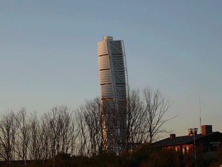 O edifício “Turning Torso” do espanhol Santiago Calatrava, se impõe na paisagem de Malmö com seus nove cubos empilhados e retorcidos em 190 metros de altura. A torre tem um esqueleto externo revestido de painéis curvos de alumínio que recebem os planos de vidro. Do primeiro pavimento até o último, a torsão é de 90 graus. São 12 andares de uso comercial e o restante de uso residencial, num total de 54 pisos. É o edifício mais alto da Suécia e o segundo maior da Europa.