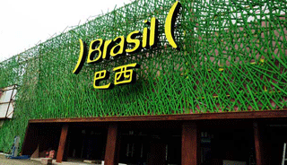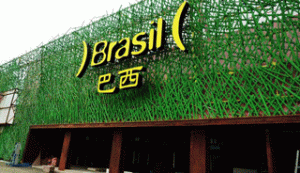 Não vi pessoalmente, mas pela fotos disponíveis no site oficial o estande brasileiro parece muito chinfrim. A fachada é feita de tiras de madeira pintada de verde apoiadas sobre estrutura metálica. Uma visitante comentou que a impressão é que a trama é muito vazada e a aparência é de falta de acabamento. O tema do pavilhão é “Cidades Pulsantes”. O logotipo na fachada é a palavra Brasil entre parêntesis invertidos. Segundo o site oficial, simboliza algo vibrando e pulsando, conforme a linguagem dos desenhos animados. Forçou.