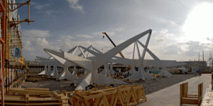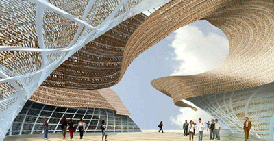 Desenhado pelo escritório catalão EMBT Miralles- Tagliabue, o espaço da Espanha tem 7 mil metros quadrados e o tema Construções Habitáveis. A fachada é recoberta por uma trama inspirada em cestaria e o prédio usa materiais leves como bambu e papel para proporcionar transparência da estrutura.