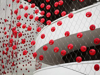 Outro destaque é a fachada no pavilhão, com discos de resina com LEDs apoiados sobre uma rede metálica. O prédio tem 4 mil metros quadrados e é obra dos escritórios Buchner Brundler e Element GmbH, vencedores de concurso realizado em 2006. “Cidade e Campo” é o título do projeto.