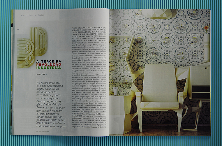 Vozes e ruídos dos bairros do Grajaú, Cidade Tiradentes e da região da Santa Ifigênia, em São Paulo, se fundem ao desenho de cadeiras ícones do design paulistano. Um pote raro de cerâmica marajoara é clonado e estudado pelo mundo afora, sem risco de quebrar. Uma família manuseia uma réplica de seu bebê em gestação. São alguns projetos de designers brasileiros com impressão 3D, ou fabricação digital aditiva. A fabricação digital é um processo em que desenhos feitos ou transformados no computador são materializados. Há três técnicas: aditivas, subtrativas e conformativas (ou formativas). As aditivas produzem objetos pela sobreposição de camadas sucessivas de material líquido ou em pó, como resina, plásticos diversos, gesso ou metal, que são solidificadas, umas sobre as outras. As subtrativas removem material de um bloco, como uma escultura, com cortadoras, perfuradoras e fresas. As técnicas conformativas ou formativas moldam e curvam chapas.