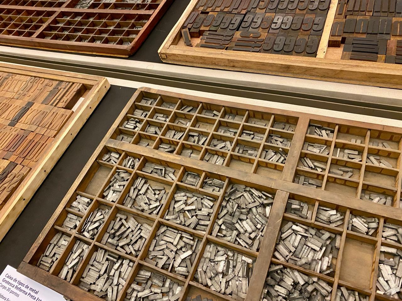 “A exposição não tem o objetivo apenas de recuperar o passado, mas também mostrar o que se faz hoje com essa tecnologia. Por isso, temos uma parte dos equipamentos da Oficina Tipográfica São Paulo”, conta Priscila Lena Farias, coordenadora do projeto e uma das curadoras da mostra. Entre os equipamentos, então gavetas de tipos de metal e de madeira, componedores, tintas, utensílios da produção dos impressos, além catálogos de ornamentos e tipos.