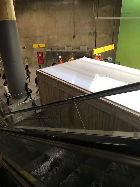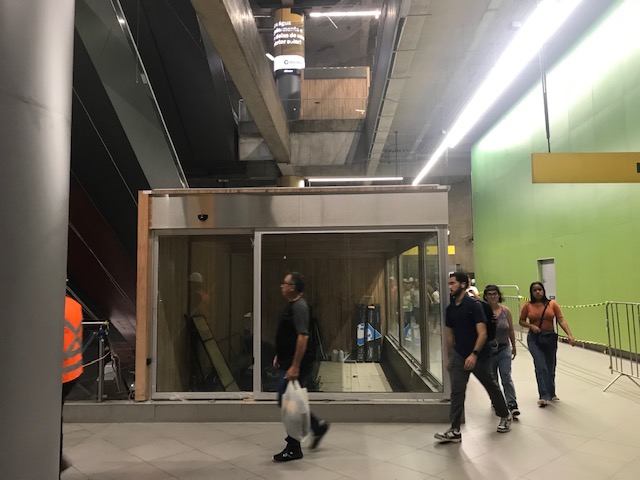 A Estação Pinheiros do metrô, da Linha 4, Amarela, está em obras. Novos quiosques estão sendo montados, nos corredores que eram – e deveriam continuar a ser – destinados apenas ao trajeto já tortuoso dos passageiros entre cada um dos lances de escadas rolantes dos pisos. O nome da estação e as sinalizações sobre navegação que ficavam nas plataformas de embarque foram apagados.